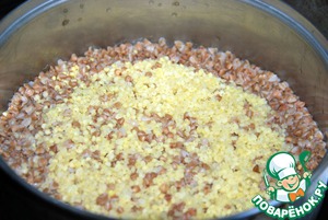 • Крупу смешиваем и промываем тёплой водой, чтобы пшено не горчило. Заливаем водой в соотношении 1 к 2. Для гречки требуется меньше воды для варки, для пшена больше. Добавлем соль по вкусу, доводим до кипения и варим при закрытой крышке на медленном огне 20 минут.