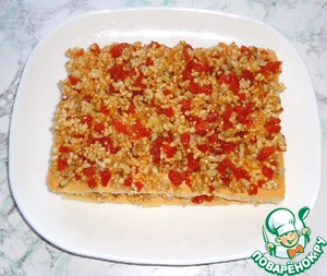 На каждый корж, кроме последнего, выложить подготовленную начинку.