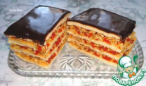 Приготовить шоколадную глазурь: какао, сливочное масло, сахар, молоко поставить на медленный огонь, постоянно помешивая, довести до кипения и кипятить 1-2 минуты. Глазурь немного остудить и полить сверху последний корж.
