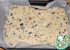 Вливаем холодное молоко, хорошенько перемешиваем, и добавляем два яйца. Все перемешиваем и выкладываем в форму (у меня 21х29см) выстеленную бумагой для запекания.