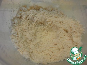 Муку смешиваем с разрыхлителем и маслом до крошек. Делаем в середине углубление.