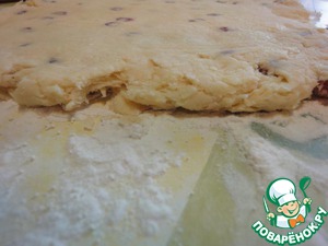 Раскатать на присыпанной мукой поверхности тесто (примерно 2 см толщиной).