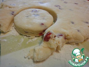 Вырезаем из теста 14 кружков круглой формочкой (диаметр 7 см) и перекладываем на противень. (также, половину сконов можно убрать в морозильник и они могут лежать как полуфабрикат, и если неожиданно нагрянут гости разогреваем духовку, вынимаем сконы из морозилки и выпекаем).