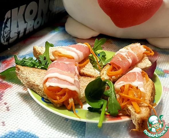 Оригинальные бутерброды с беконом и корейской морковкой.