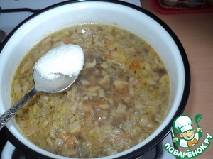 За 5 минут до окончания варки кладём перец горошком и лавровый лист. Пробуем, солим. Суп достаточно кислый, поэтому "выравниваем" вкус добавлением сахара. -