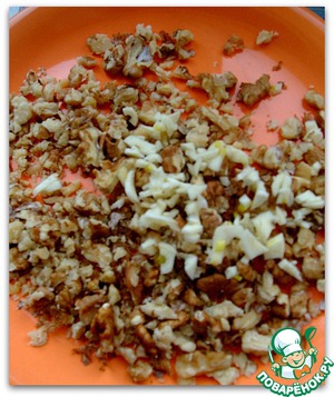 Чеснок нарезаем маленькими кусочками, грецкие орехи измельчаем ножом.