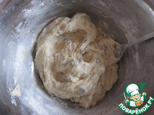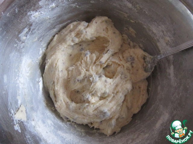 Через 15 минут добавляем муку, ванилин, соду и замешиваем тесто.