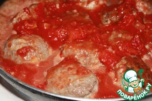 Жарьте тефтели на сковороде, разогретой с маслом, с двух сторон до золотистого цвета. Затем выложите томаты в собственном соку и готовьте под крышкой 20 минут.