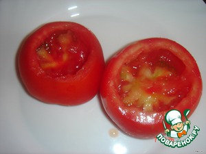 У помидоров срезать верхушку крышечкой и чайной ложкой или ножом аккуратно удалить мякоть