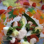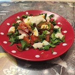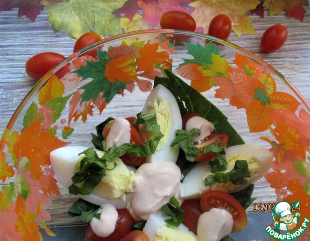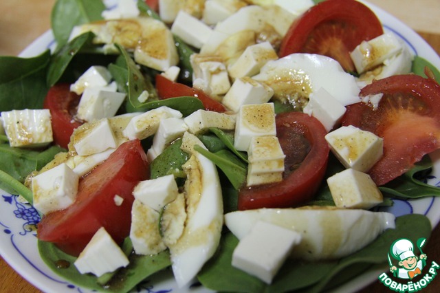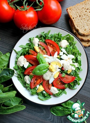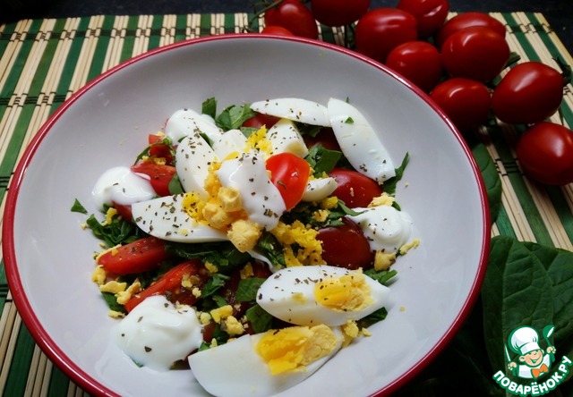 Переложите овощи на блюдо, чередуя ломтики помидоров, яиц и нарезанный шпинат. Залейте салат, приготовленным соусом. Украсьте шпинатом, ломтиками помидор и каплями соуса.