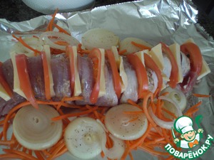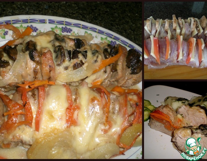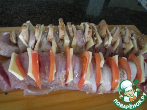 Разрезаем его на порционные куски, только не до конца, по форме должно напоминать гармошку. Мясо можно снова натереть специями, если кто не любит, то можно и не натирать. В каждый разрез кладем кусочек сыра и помидора, также, вместо сыра и помидоров, можно положить грибы или чернослив, любое на ваш вкус и фантазию. Я делала в этот раз сыр + помидор и грибы + сыр.