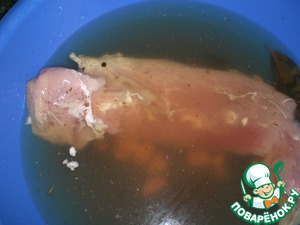 Натираем нашу корейку любимыми специями (я брала приправу к блюдам из свинины), погружаем в остывший маринад и ставим в холодное место на 5-7 дней (!). Когда мясо промариновано, оно имеет при разрезе нежно-розовый цвет. -