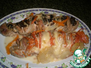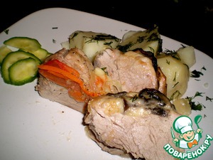 • Разрезаем его на порционные куски, только не до конца, по форме должно напоминать гармошку. Мясо можно снова натереть специями, если кто не любит, то можно и не натирать. В каждый разрез кладем кусочек сыра и помидора, также, вместо сыра и помидоров, можно положить грибы или чернослив, любое на ваш вкус и фантазию. Я делала в этот раз сыр + помидор и грибы + сыр.