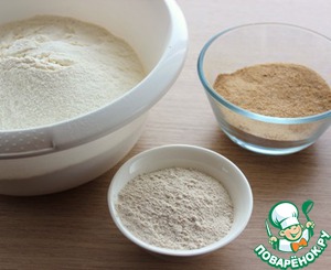 Просеять все три вида муки в большую чашку, перемешать и сформировать горку.