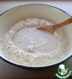 Добавить в получившуюся массу соль, дрожжи и месить тесто до тех пор, пока оно не приобретет мягкую структуру и не начнет отлипать от рук. Накрыть и дать постоять в теплом месте 40 мин.
