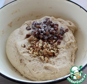 Изюм замочить в теплой воде на 5-10 мин. Обсушить и обвалять в муке, так он равномерно распределится в тесте. Орехи порубить не слишком мелко. Добавить изюм и орехи в тесто, перемешать,