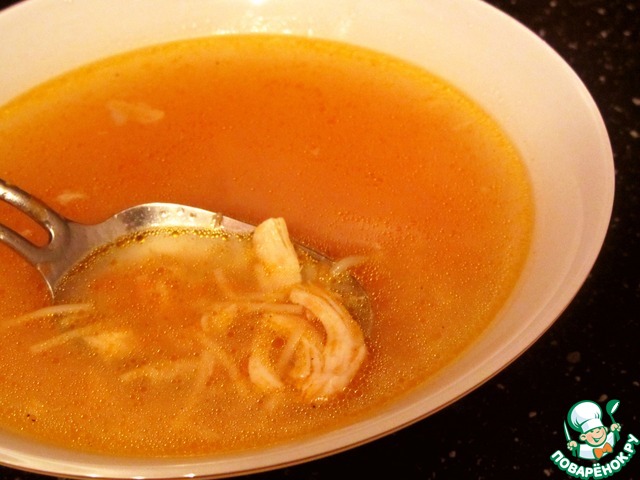 Влить в кастрюлю куриный бульон, довести до кипения. Добавить вермишель, варить до готовности согласно инструкции на её упаковке.
