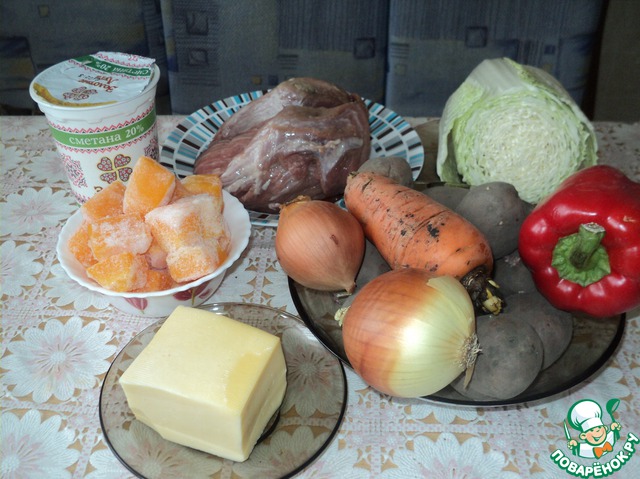 На дно горшочка кладём мясо, обжаренные овощи, тыкву, картофель, нарезанную пекинскую капусту. Все слои солим, перчим, добавляем немного молотого имбиря. Наливаем в горшочек кипячёной воды (до половины горшка), заливаем смесью майонеза и сметаны. Посыпаем тёртым сыром.