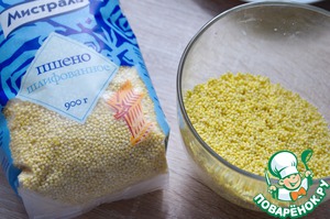• В сковородке разогреем 2 ст. ложки масла на среднем огне, добавим пшено и помешивая, обжарим до золотистого цвета и аромата, примерно около 3 минут ( замечание: не перестарайтесь).