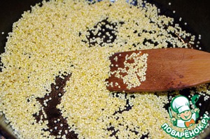 В сковородке разогреем 2 ст. ложки масла на среднем огне, добавим пшено и помешивая, обжарим до золотистого цвета и аромата, примерно около 3 минут ( замечание: не перестарайтесь).