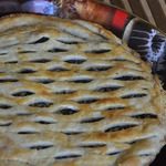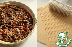 Выкладываем начинку на наше тесто, раскатываем второй пласт. Я использую ролик для создания узора, но это не обязательно. Вы можете просто закрыть тесто вторым пластом.