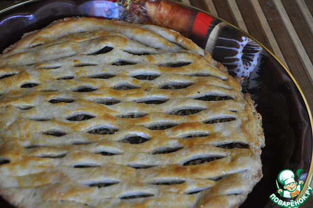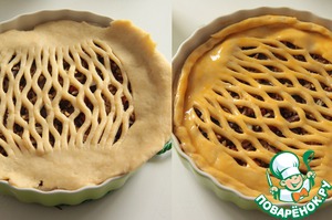 Обрезаем остатки теста, делаем маленькие полоски и выкладываем по краю. Получаются небольшие бортики. Смазываем пирог желтком и отправляем в духовку на 25 минут.