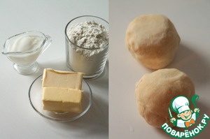 Для пирога мы приготовим песочное тесто с йогуртом. Оно получается очень легкое и нежной и прекрасно подойдет к плотной мясной начинке. Соединим муку, масло, йогурт и сахар в блендере, смешаем и вымесим тесто. Разделим на 2 шарика - один побольше, другой поменьше и отправим на 15 минут в холодильник.