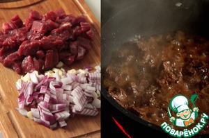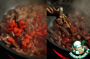 Добавим мелко нарезанную курагу, она придаст легкий сладкий привкус, который прекрасно сочетается с мясом, рисом и песочным тестом. В конце добавим коньяк и будем готовить, пока жидкость не выварится.