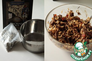 Для этого блюда нам понадобится рис Басмати микс, который я покупаю в порционных пакетах. Очень удобно, и рис всегда получается прекрасный. Отварим рис в кипящей воде 15 минут, добавим немного соли. Соединим рис и начинку и дадим им остыть.