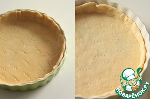 Включим духовку на 180 градусов. Раскатаем большой шарик, выложим его в форму, наколем вилкой и отправим в духовку на 10 минут.