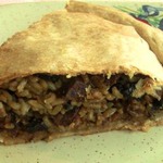 Вот наш пирог и готов. Он получается ароматный, вкусный и очень нежный. Мне понравился его вкус с нежным соусом из йогурта, соли и свежей кинзы. Приятного аппетита!
