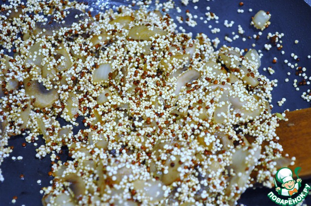 Добавить кинву и обжарить её в масле, пока всё не впитает.