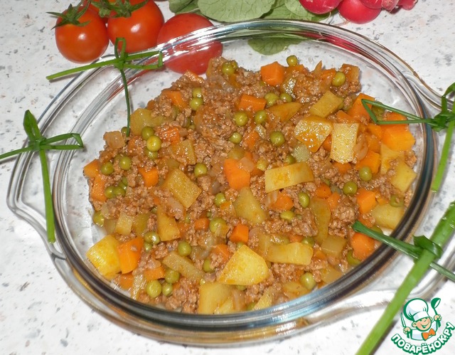 Добавляем стакан воды, соль, приправу, морковь и картошку. Перемешиваем и накрываем крышкой. Тушим до готовности картофеля (минут 10-15).