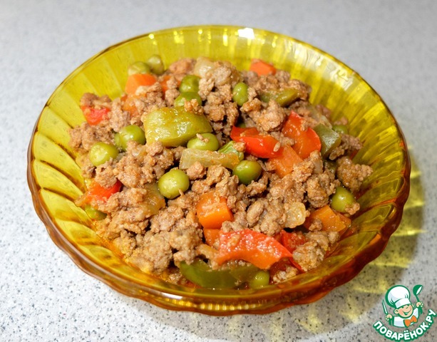 В конце добавляем зеленый горошек и болгарский перец. Перемешиваем, накрываем крышкой и ждем, пока смесь не закипит, выключаем огонь. Оставляем блюдо на 5-10 минут, чтобы перец стал мягким.