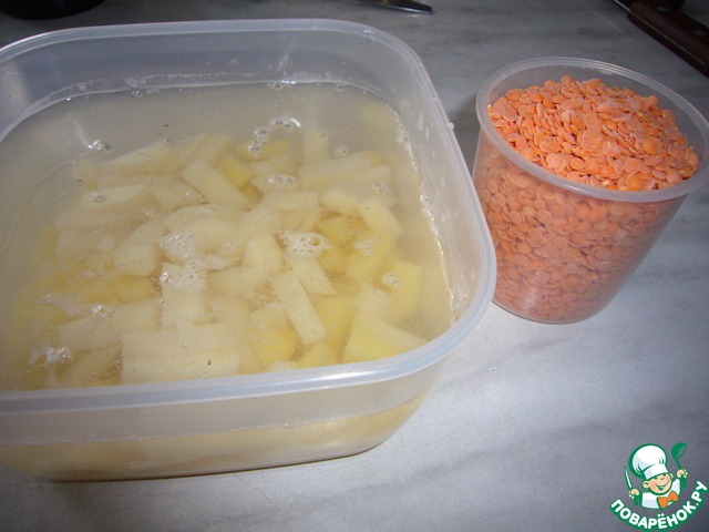 Картофель почистить и нарезать соломкой, чечевицу промыть.