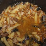 Мультиварку отключить, налить кипяток, добавить картофель и чечевицу, посолить, выставить режим "Тушение" на 1 час.