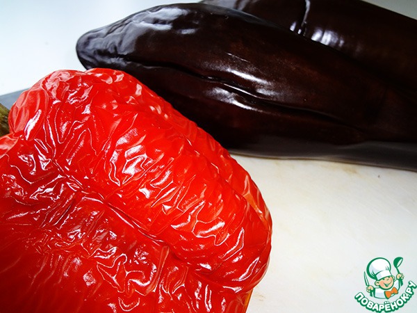 Баклажаны и сладкий перец запечь в духовке при температуре 180 гр около 30-40 мин. Снять шкурку (перед этим можно положить овощи минут на 10 в целлофановый пакет).
