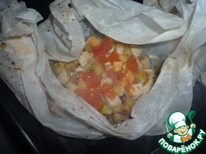 Курочка с овощами и сыром, запеченная в бумаге для выпечки. Очень вкусное, ароматное блюдо! Просто пальчики оближешь!