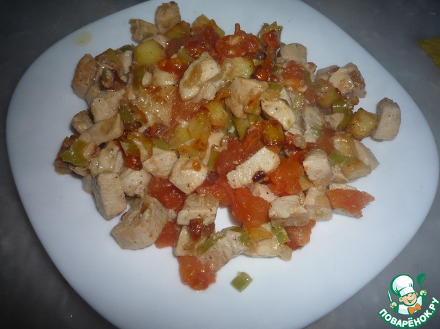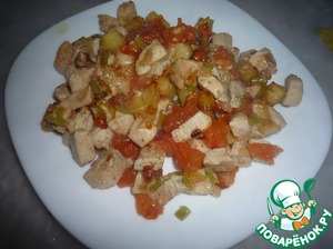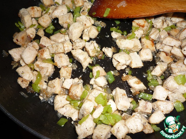 Курицу режем небольшими кусочками, жарим на масле до того момента, когда курица будет белой. Добавляем мелко нарезанный лук и чеснок. Перемешиваем. Добавляем мелко нарезанный перец. Солим, перчим. Тушим минут 10.
