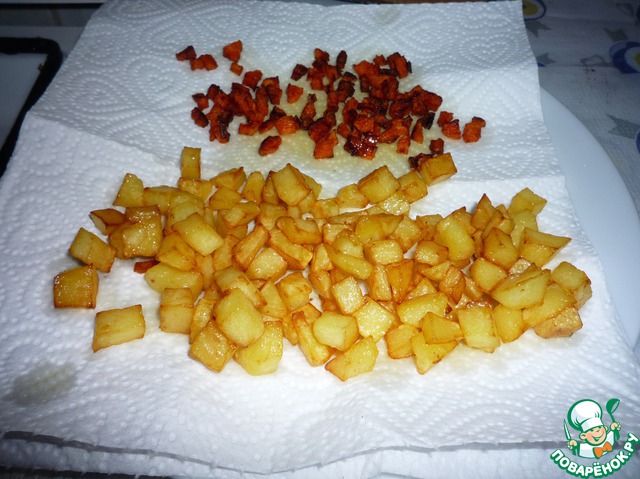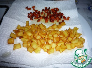 Режем кубиками морковь и картофель, жарим по отдельности, выкладываем на салфетку, чтобы убрать лишнее масло.