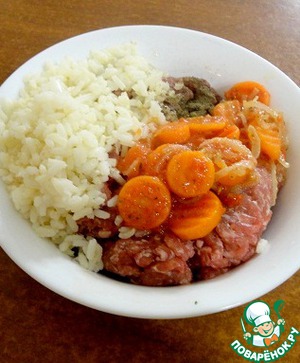 В фарш добавить специи, рис (он уже отваренный), 1/2 часть зажарки.