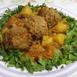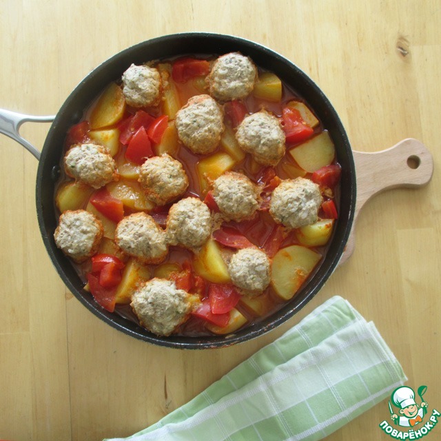 Сверху укладываем картофель, порезанный кубиками, на него фрикадельки.