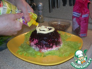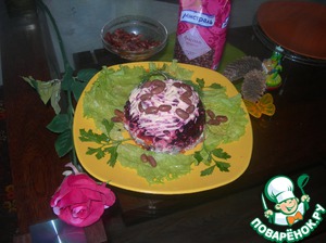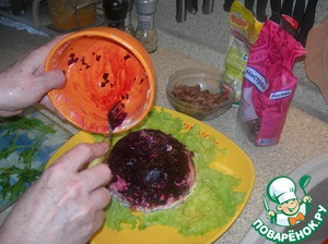 Послойно выкладываем их в форму: снизу первой идет свекла, за ней морковь, ФАСОЛЬ, картофель. ВСЕ слои промазываем немного майонезом. Укладываем бережно нашe филе.