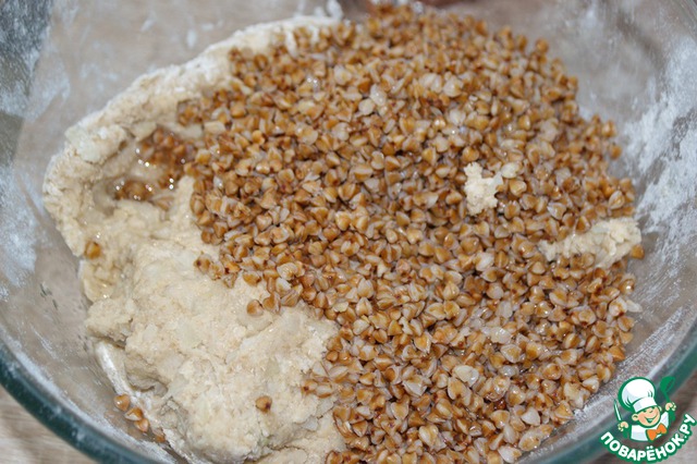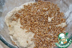 Замесить тесто (оно будет липким), добавить зерна гречки и растительное масло.