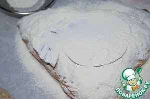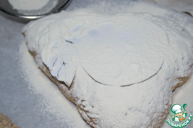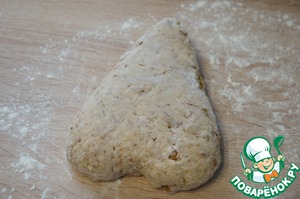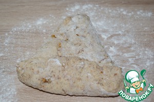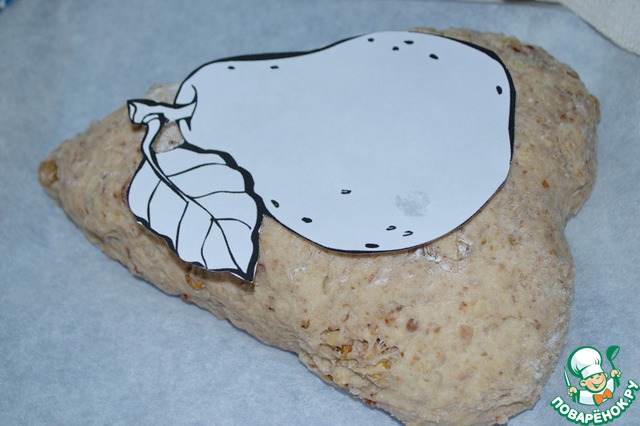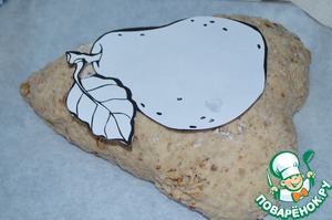 Подошедшее тесто разделить на 2 части. Одну часть расплющить в лепешку и начать формировать грушу. Сначала одну сторону заворачиваем, формируя, как бы, треугольник.