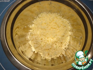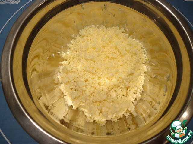 В это время готовлю начинку: в блендере измельчаю очищенный чеснок и сыр, но не до состояния каши, а до небольших кусочков.