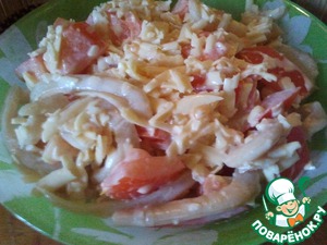 • Соединяем кальмары, помидор и сыр. Заправляем неполной столовой ложкой майонеза. Больше не надо, т. к. еще помидоры дадут сок. Пробуем, подсаливаем по вкусу.