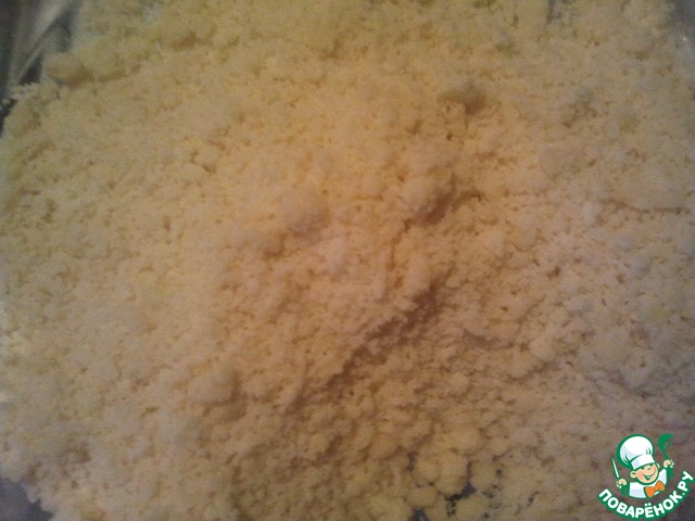 Готовим штрейзель. В муку добавляем сахар. Масло (или маргарин) рубим ножом, а потом перетираем с мукой и сахаром руками в крошку.