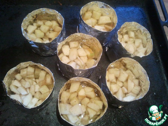 Формочки ставим на противень, засыпаем на дно яблоки.