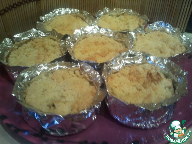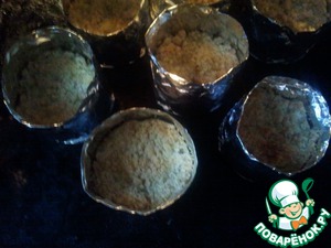 В оригинальном рецепте этот десерт готовился в маленьких порциoнных жаропрочных формочках, я же за неимением оных их соорудила из фольги. Но в такой таре этот десерт очень удобно брать на природу.